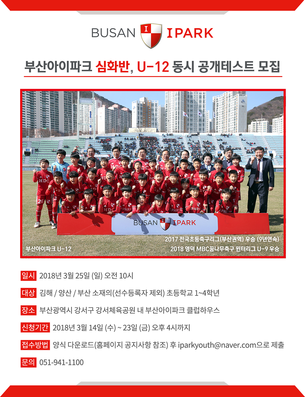 ºÎ»êÀÇ À¯¼Ò³â ½Ã½ºÅÛÀ¸·Î ´ëÇѹα¹ ±¹°¡´ëÇ¥ Ãâ½Å ÀÌÁ¤Çù, ÃÖ½ÂÀÎ, ±èÁø±Ô µî ´Ù¼öÀÇ ÇÁ·ÎÃ౸¼±¼ö¸¦ ¹èÃâÇÑ ºÎ»ê¾ÆÀÌÆÄÅ©´Â ¿À´Â 3¿ù 25ÀÏ(ÀÏ) ºÎ»ê±¤¿ª½Ã °¼±¸ °¼Ã¼À°°ø¿ø ³» ºÎ»ê¾ÆÀÌÆÄÅ© Ŭ·´ÇϿ콺¿¡¼ 2018 À¯¼Ò³â ½ÉÈ¹Ý ¹× U-12 °ø°³Å×½ºÆ®¸¦ ½Ç½ÃÇÑ´Ù. À̹ø °ø°³Å×½ºÆ®´Â ±èÇØ, ¾ç»ê, ºÎ»ê ¼ÒÀçÀÇ(¼±¼öµî·ÏÀÚ Á¦¿Ü) ÃʵîÇб³ 1~4Çг⿡ ÀçÇÐ ÁßÀÎ ¾î¸°ÀÌ¸é ´©±¸³ª Áö¿øÀÌ °¡´ÉÇÏ´Ù.