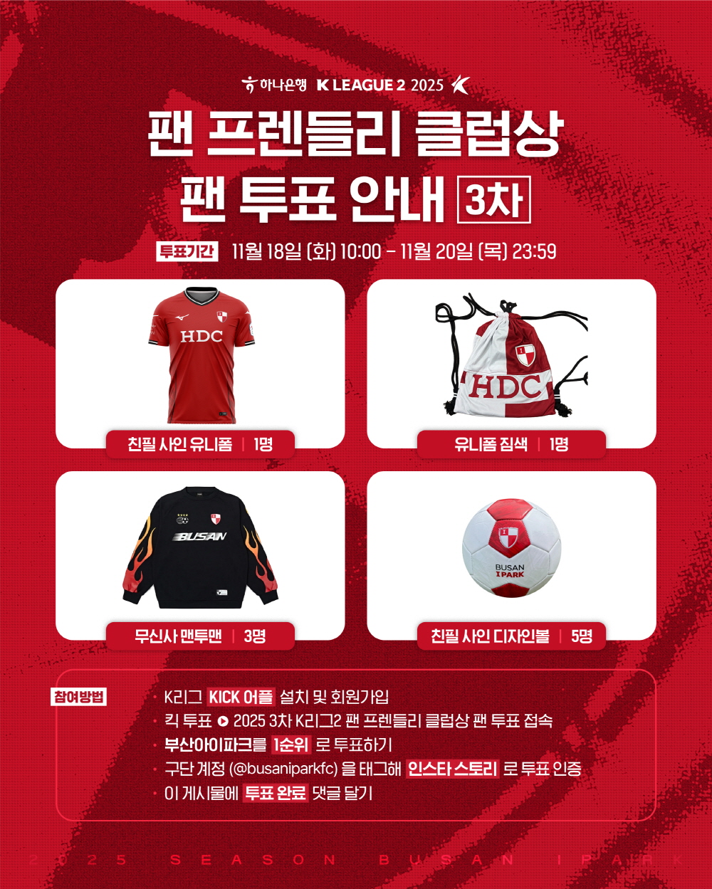 ÇÑÆí, ÆÒ ÇÁ·»µé¸® Ŭ·´»ó ÆÒ ÅõÇ¥´Â 11¿ù 18ÀÏ(È)ºÎÅÍ 20ÀÏ(¸ñ)±îÁö K¸®±× °ø½Ä ¾îÇø®ÄÉÀÌ¼Ç ‘Kick’À» ÅëÇØ ÁøÇàµÈ´Ù. ºÎ»êÀº ºÎ»êÀ» 1¼øÀ§·Î ÅõÇ¥Çϰí ÀÎÁõÇÑ ÆÒÀ» ´ë»óÀ¸·Î Ãß÷À» ÅëÇØ ¼±¼ö´Ü Ä£ÇÊ »çÀÎ À¯´ÏÆû ȤÀº µðÀÚÀκ¼°ú ´õºÒ¾î À¯´ÏÆû Áü»ö, ¹«½Å»ç ¸ÇÅõ¸Ç µîÀ» ÁõÁ¤ÇÑ´Ù.