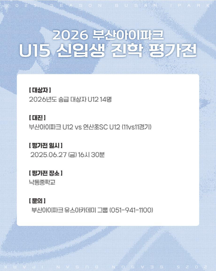 2026 ºÎ»ê¾ÆÀÌÆÄÅ© U15 ½ÅÀÔ»ý ÁøÇÐ Æò°¡Àü (3Â÷)¡à´ë»óÀÚ : 2025³âµµ ½Â±Þ ´ë»óÀÚ U12 14¸í
